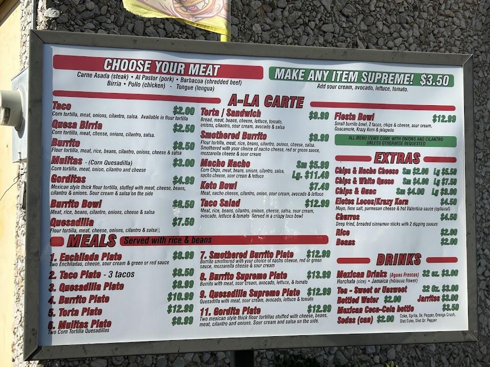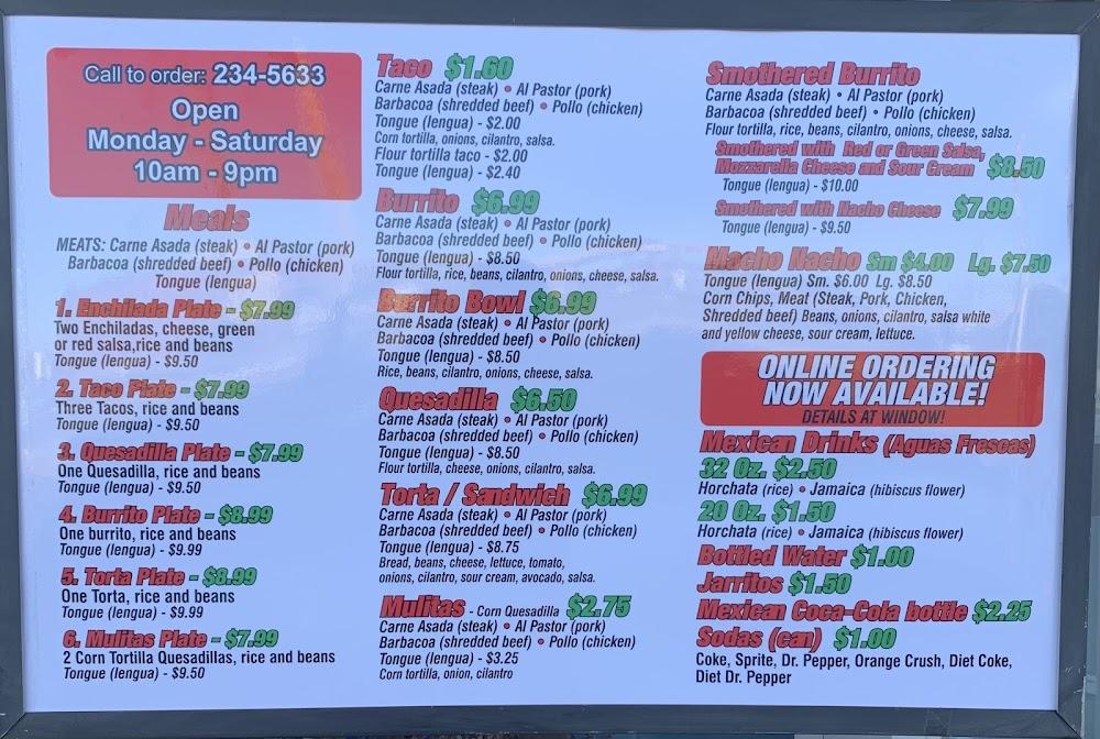 Highlights include carne asada tacos at just $1.25 each, and generous burritos for about $5.00.