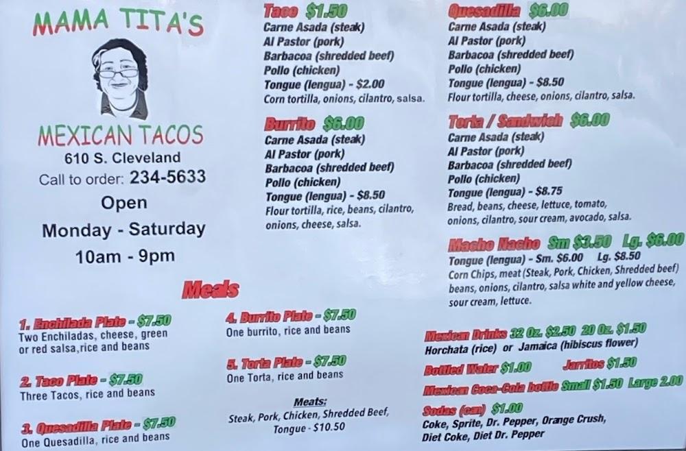 Mama Tita's menu focuses on traditional Mexican street food, featuring authentic tacos, burritos, and quesadillas.